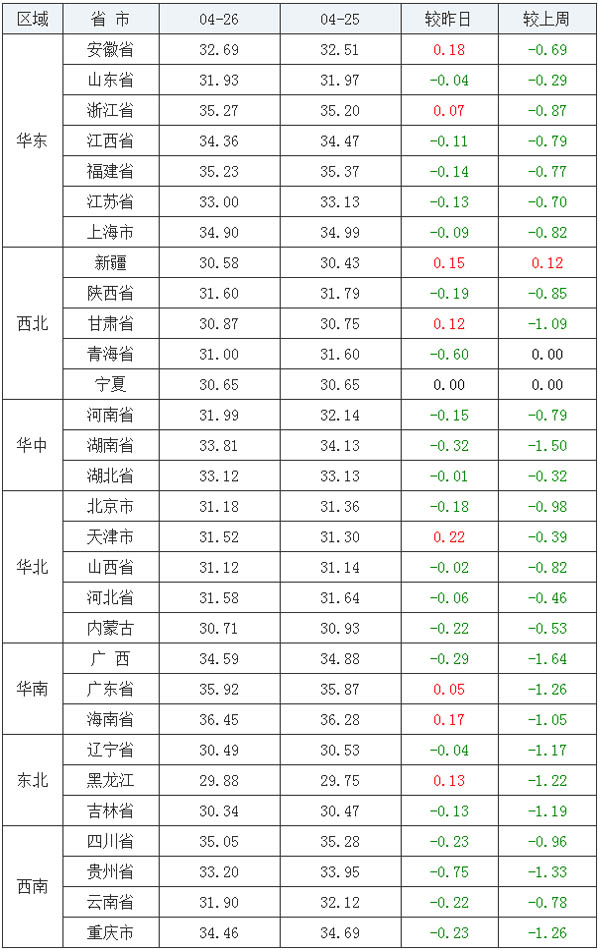 4月30日全國外三元生豬價格均價32.43元/公斤,較昨日每公斤下跌了0.13元,較上周同期每公斤下跌了0.77元,較上月同期每公斤下跌了2.13元。隨著氣溫的升高,進入肉類消費淡季,消