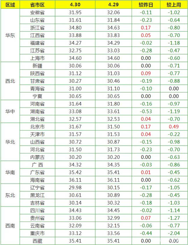 2020-04-30 今日全國各地區豬價漲跌行情表,仍然大范圍下跌