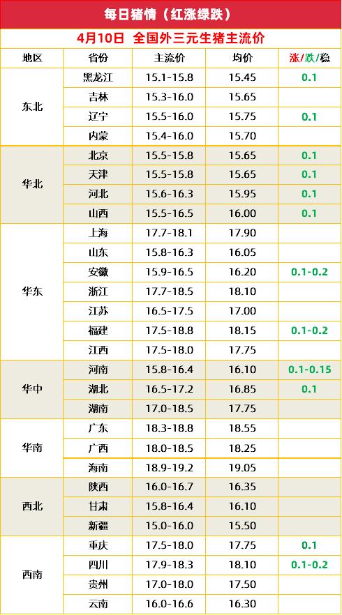 - 根據系統數據監測,今日全國外三元生豬均價為33.78元/公斤,生豬均價較昨日上漲0.06元/公斤,較上周(4月7日33.75元/公斤)上漲0.03元/公斤。今日豬價與上周豬價相比,是近月來