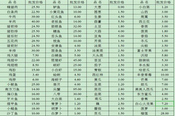 表中數據,豆角、黃瓜、藕價格小幅下降;西紅柿、菜花、茭瓜、小白菜、茼蒿、西蘭花、菠菜價格小幅上漲。