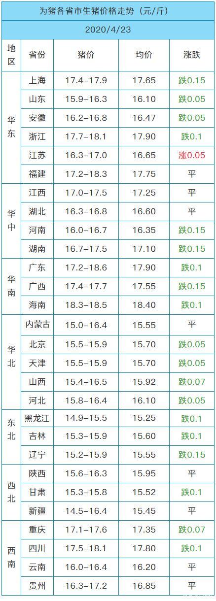 關于4月23日國內生豬的價格,全國均為16.56元/斤,環比昨天下跌了0.06元/斤。具體各省市的生豬價格以及漲跌幅度請看下表。