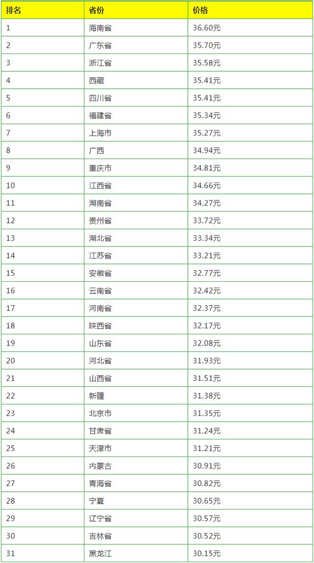 最后,可以看到,位居第一的海南省外三元生豬價格相對來說還是有點微高的,與第二名的廣東省相比貴了0.9毛。而看二三名、三四名,甚至四五名、五六名之間的差距并不大,都是一兩毛,兩三毛。