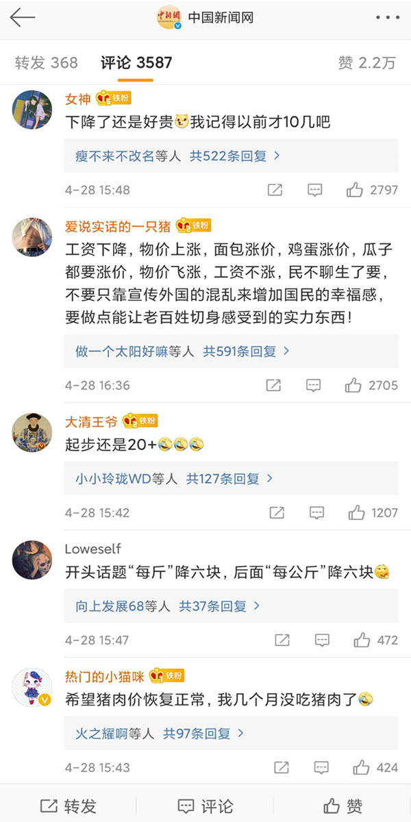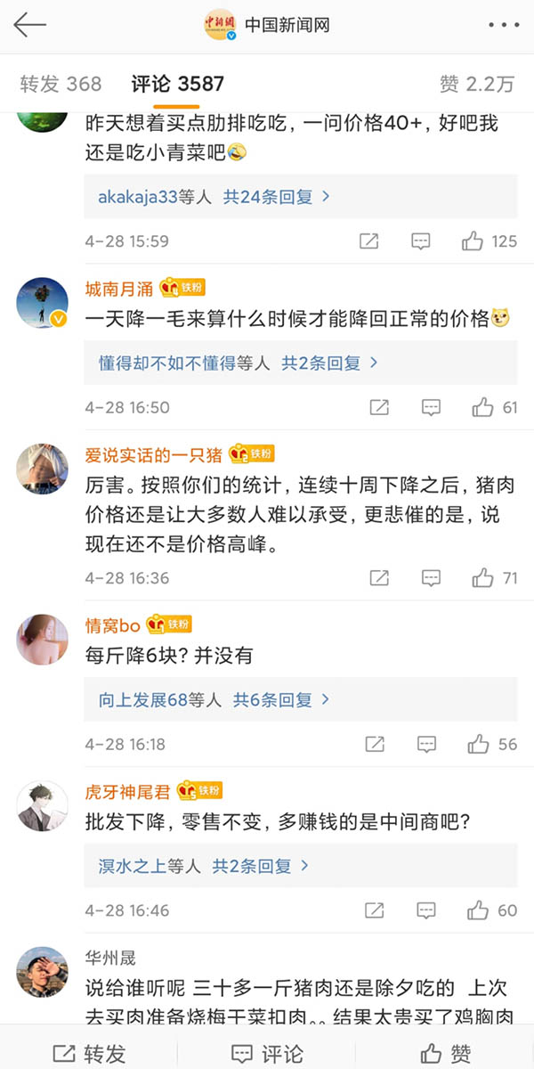 今天(4月28日)下午,農業農村部發展規劃司司長魏百剛表示,“菜籃子”產品價格持續回落。目前,豬肉批發價格已連續10周下降,每公斤降了6塊錢左右,蔬菜、水果等鮮活農產品供給增加,價格基本回落到常年水平。