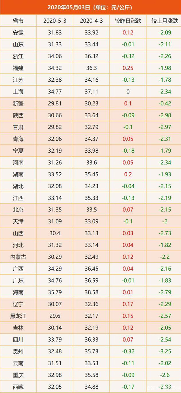 從監(jiān)測(cè)到的數(shù)據(jù)來(lái)看,5月3日全國(guó)各地區(qū)外三元生豬的平均價(jià)格一片“紅色”,細(xì)數(shù)一看,16個(gè)省市呈現(xiàn)上漲狀態(tài)!雖然整體均價(jià)還是下跌的,但是已經(jīng)明顯看到下滑的趨勢(shì)越來(lái)越緩了。