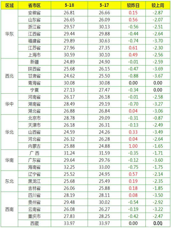 這段時間國內生豬均價一直下跌,一眼望去全是綠色,直到今天(5月18日),突然開始飄紅,還是飄一片紅,生豬漲價了!今日全國外三元生豬均價為27.32元/公斤,較昨日上漲了0.51元