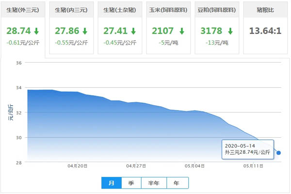 - 對于養豬戶來說,這真是一個糟糕的消息,今日(5月14日)全國外三元生豬均價為28.74元/公斤,跟昨日相比,下跌了0.61元公斤。罕見的是,全國今日竟然無一省市豬價上漲,全線下跌