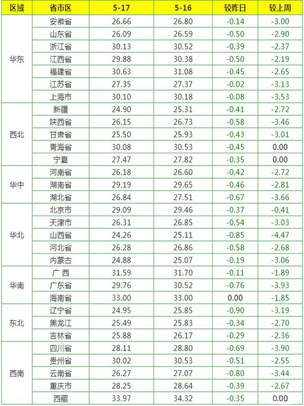 - 2020-05-17 今日生豬價格行情,雖全國飄綠但跌幅減小!